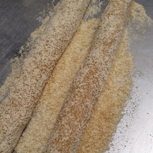 für die Teigrollen außen herum Mandeln und braunen Zucker mischen Rollen darin wälzen